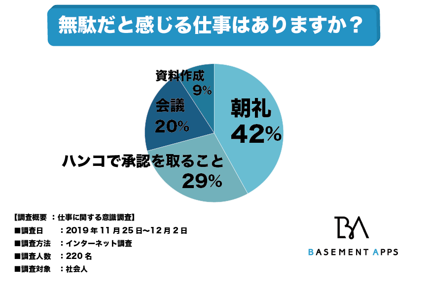 日本網站BASEMENT APPS對於「感到浪費的工作」進行調查,在220名受訪者中有42%的人選擇了「朝會」。日本的朝會文化源於製造業。在製造業中,通過在一天工作開始前分配任務來提高工作效率。然而,現代已經能夠在不進行早會的情況下檢查自己的任務,因此早會被認為已經成為過時的業務方式。