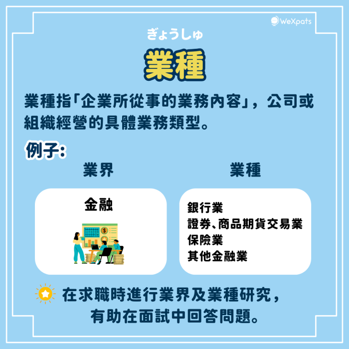 「業界」、「業種」、「職種」是指不同的概念,了解他們的分別可方便你在求職網站上搜尋招聘資訊。而且進行業界、業種、職種研究可幫助更有效率地進行求職,確保找到符合自己期望的工作,從而避免因為不充分了解行業而造成的不必要損失,在日本求職時請多注意!