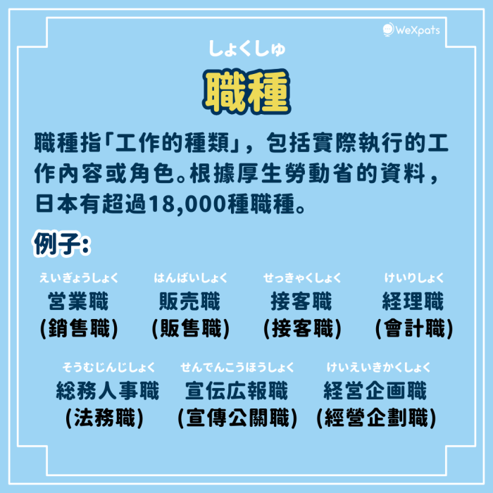 職種指工作的種類,即實際執行的工作內容或角色。根據厚生勞動省所編的職業分類,日本有超過18,000種職種。
