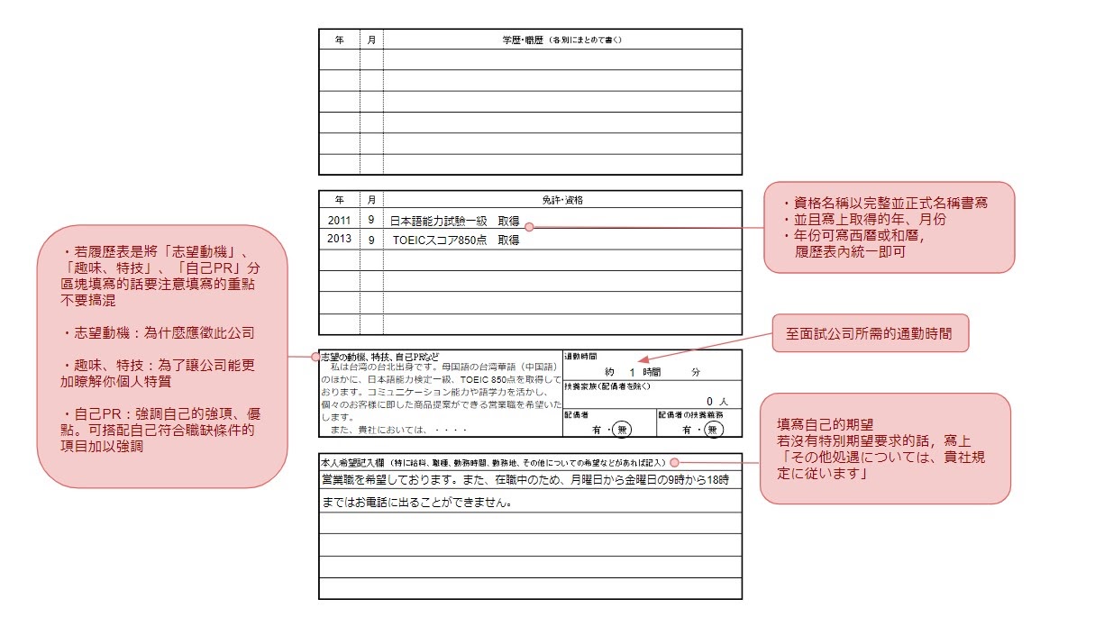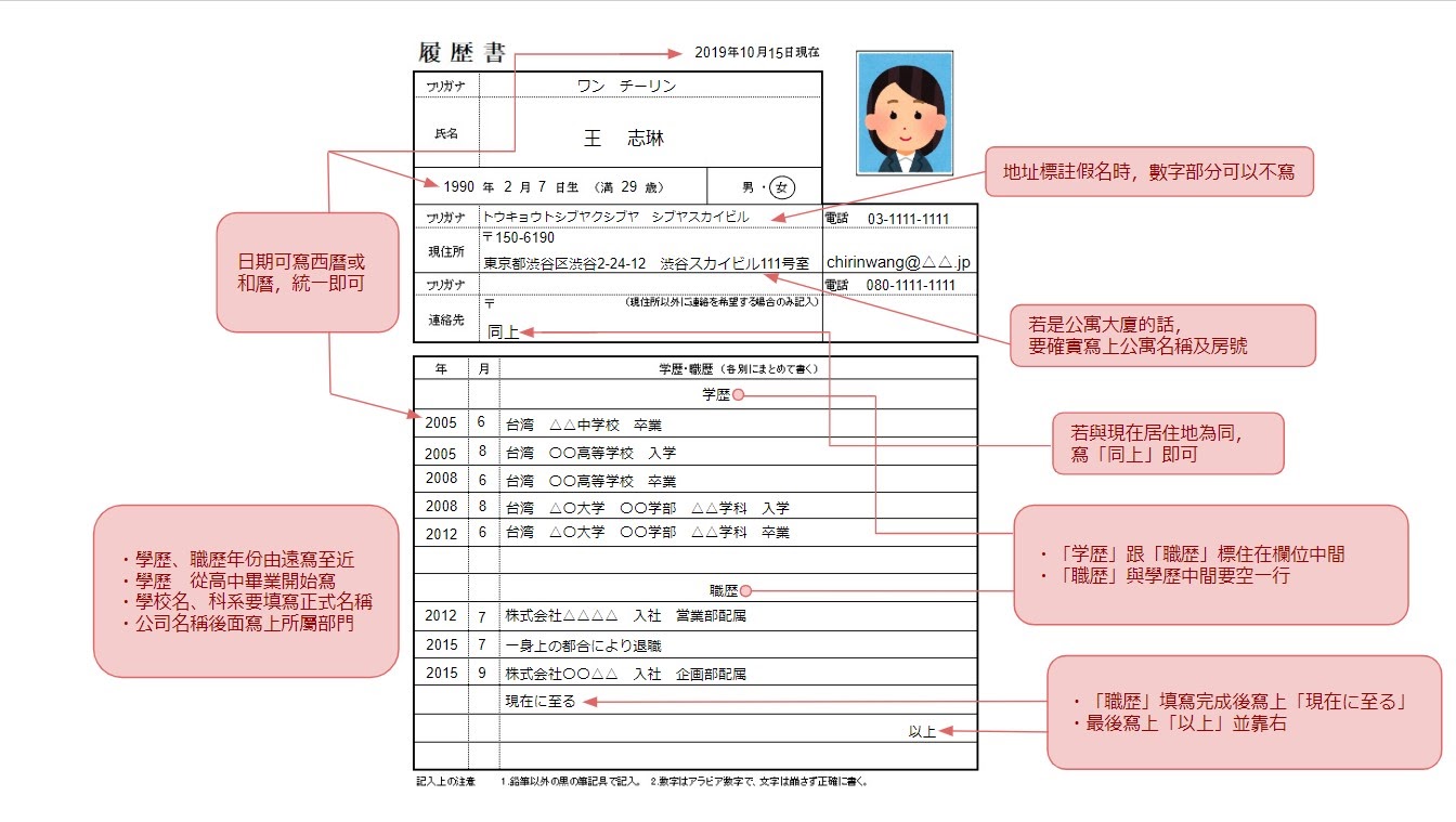 「学歴」跟「職歴」標住在欄位中間,並且「職歴」與學歷間要空一行。