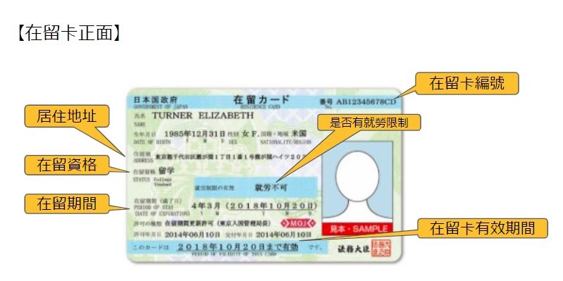 在留卡上記載有姓名、出生年月日、性別、國籍、地區、居住地、在留資格、在留期限、可否就業等法務大臣所掌握的重要事項,記載事項發生改變時,應履行變更事項的申報義務,確保在留卡上的資訊為最新。16歲以上者的在留卡上應有本人照片。
