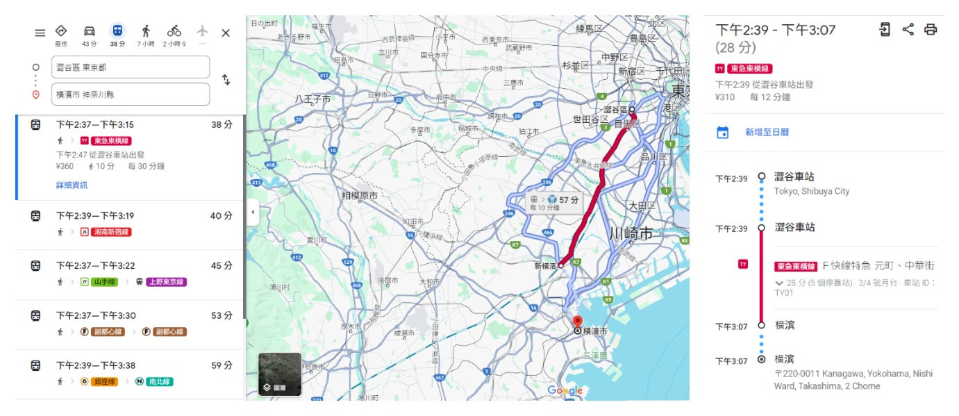 使用Google Map除了可以搜尋步行、行車路線,也可搜尋電車等交通路線。只要輸入起點及終點,出發或到達時間,馬上便會列出交通路線資訊。例如上圖搜尋澀谷至橫濱的路線,Google Map會列出不同路線,包括東京metro的東急東橫線、JR湘南新宿線等等,而點進去會看到搭乘時間、多少個停靠站等等,方便選擇哪條路線。