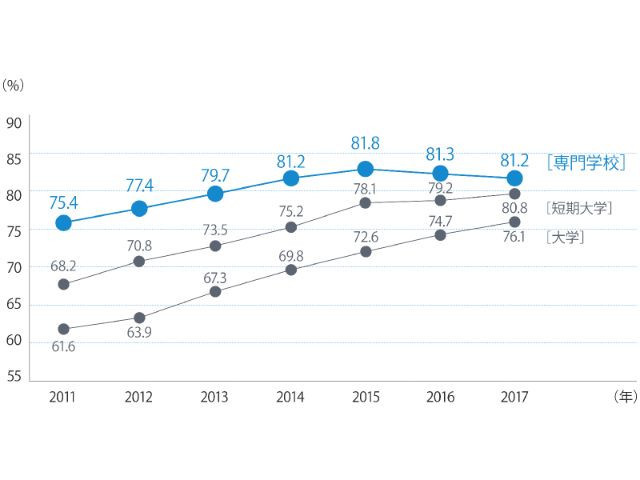 事實上,許多人選擇就讀專門學校是因為工作,那麼畢業後的職業道路和就業率是怎樣?根據技術與職業教育協會的數據,2017年專門學校的就業率(畢業生中就業者的比例)為81.2%,高於短期大學(80.8%)和大學(76.1%)。