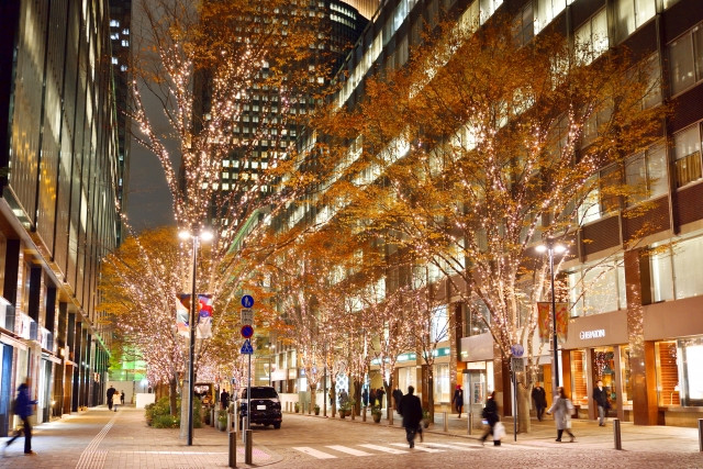 丸之内鄰近皇居及東京車站,是日本一大商業重鎮,那裡有很多時尚的辨公大樓與商場,街道兩邊名牌商店林立。而在丸之内的大手町仲通,每年冬日,路邊220棵樹木都會點起金黃色燈光,120萬個LED燈泡形成一道閃閃發亮的黃金隧道,看起來十分華麗,在2016年更被選為日本夜景遺産」。