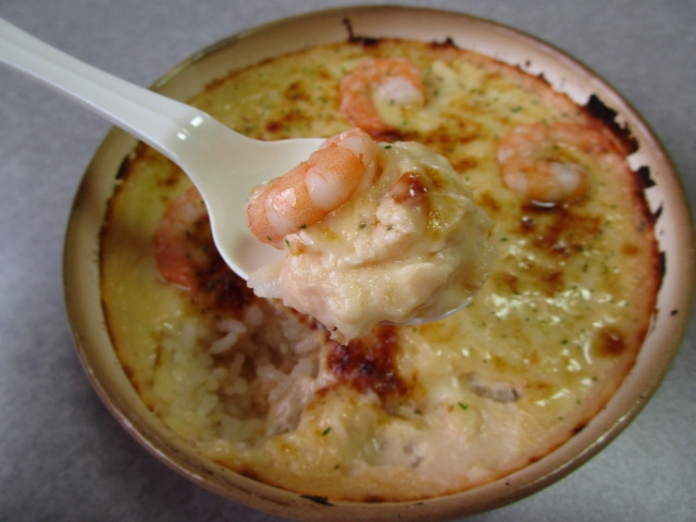說到焗烤飯,很多人會想到日本家庭餐廳薩莉亞的招牌肉醬焗烤飯。其實也是由Hotel New Grand的料理長發明,當時有一名顧客因為身體不太舒服,所以要求料理長製作容易品嚐的料理,於是他便在抓飯澆上蝦子白醬,再灑上起司烤焗,滑順的醬汁拌著米飯很易入口,味道又很好,而正式列在菜單上。其他餐廳也跟著模仿,成為現在日本常見的洋食料理之人,在各大便利商店也可買到。