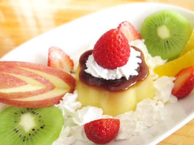 最後是布丁聖代,看起來就跟我們熟悉的聖代一樣,只是以布丁為主角,旁邊放滿鮮奶油、水果、餅乾條等等。布丁聖代的日文名字是「プリンアラモード」 (pudding à la mode) ,而à la mode就是從法文而來,有流行、最新的意思。在昭和年代,為了取悅一眾美軍高級上校的夫人,Hotel New Grand的咖啡廳想到把布丁、水果及冰淇淋做成一道甜點,好看又美味而廣泛流傳。而現在與拿坡里義大利麵一同被認為是很懐舊的料理。