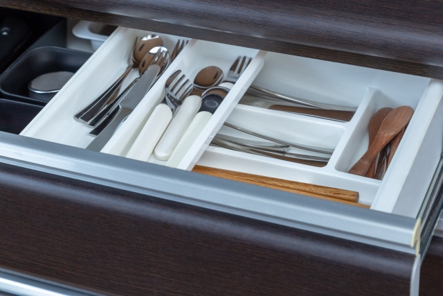 廚房的食材與廚具收納都是很多主婦煩惱的問題。首先整理廚具及餐具,由於都是經常用的物品,所以最好把它們分類好,然後放在指定的位置,方便每次拿起來使用,就不用花時間去搜索。對於最常用的東西,如筷子、湯匙等可以買一些專用的盒子去存放,更衛生也更一目了然。其他小物如便當用的紙杯、小竹籤等也可以把它們按大小整理好。