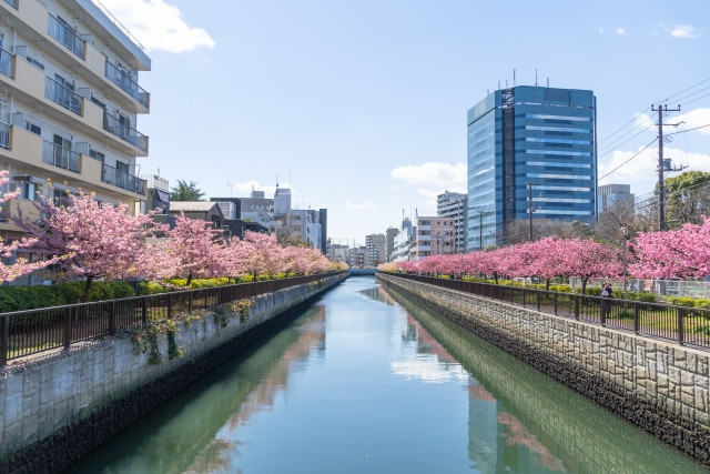 位於門前仲町的大横川,是一條在江戶時代就建造的運河,在古時很多貨船都經過這道運河來到東京灣,但現在已變成普通的河流,河旁成為休憩作用的公園。在大横川兩邊也會種滿櫻花,滿開時樹枝長到河的上方,平靜的河面上映照樹上的櫻花,粉紅的櫻花河非常迷人。在這段期間,當地和船友之會更會特地開出人手划的木船,只要500日幣便可在河上賞櫻,是個獨特的賞櫻方法喔!