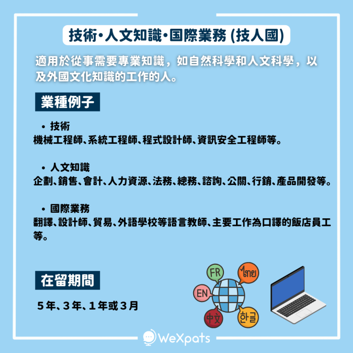 「技術・人文知識・國際業務」是針對技術人員和專業人士所授予的在留資格。適用於從事需要自然科學或人文科學等專業知識、以及與外國文化相關知識的業務,包括機械工程師、翻譯、設計師、私人企業語言教師、行銷人員等。申請者需通過學歷或持有專業資格的審查證明自己具備專業知識,雇主的業務內容與規模也會被考量,以確認是否確實需要外國專業人才。