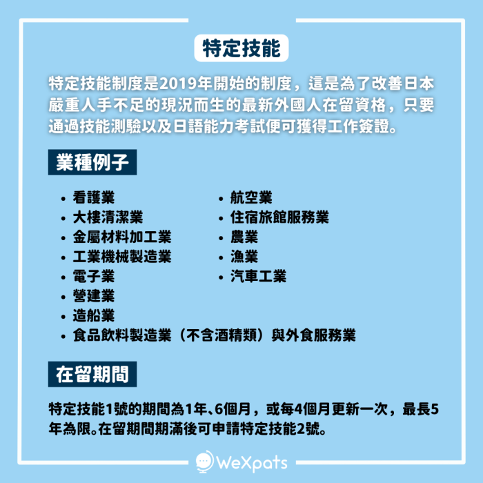 延伸閱讀 : 詳細說明「特定技能」1號和2號的14 業種!日本最新居留簽證制度,外國人也有機會永久居留日本